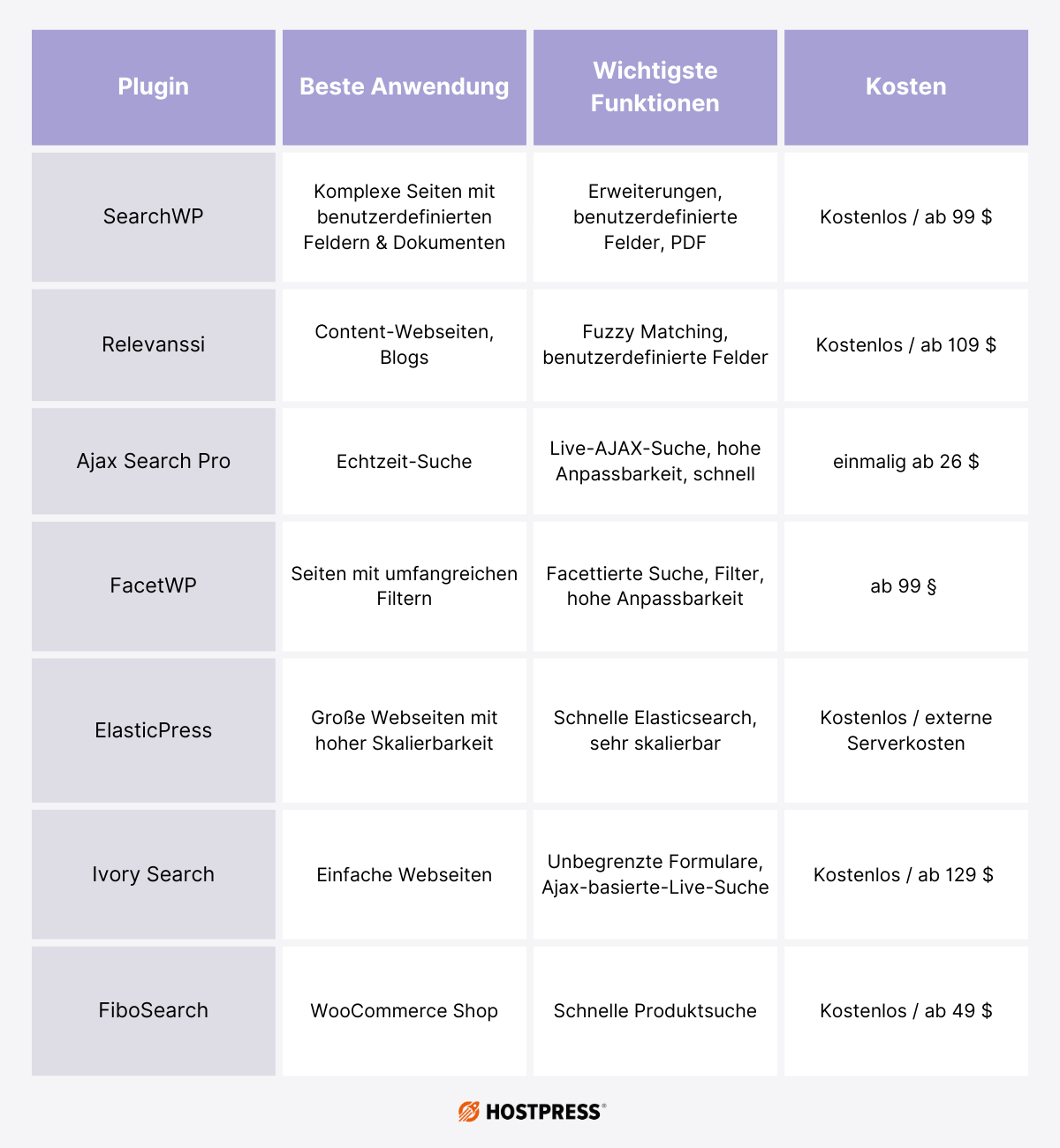 Die Search Plugins eignen sich alle sehr gut, um eine intelligente Suchfunktion auf deiner Webseite zu integrieren. Nicht jedes der Plugins eignet sich auch genauso gut für dein Business. Deswegen siehst du hier nochmal einen Überblick, über die wichtigsten Faktoren.
