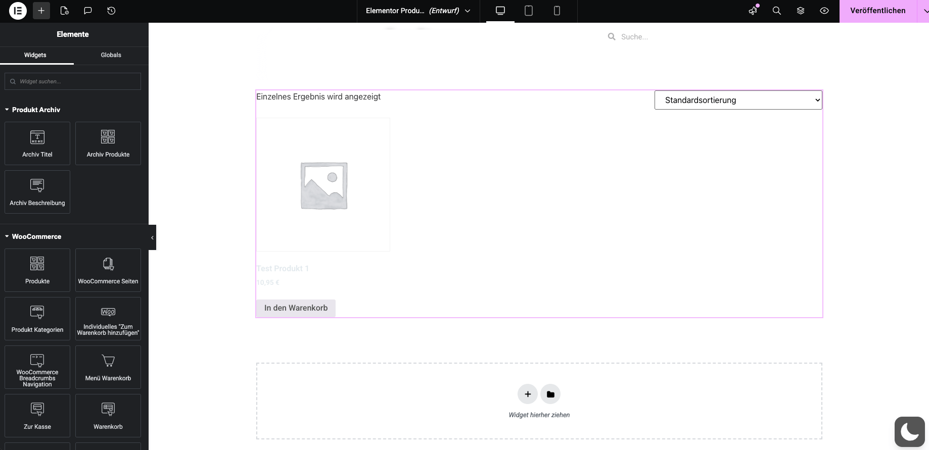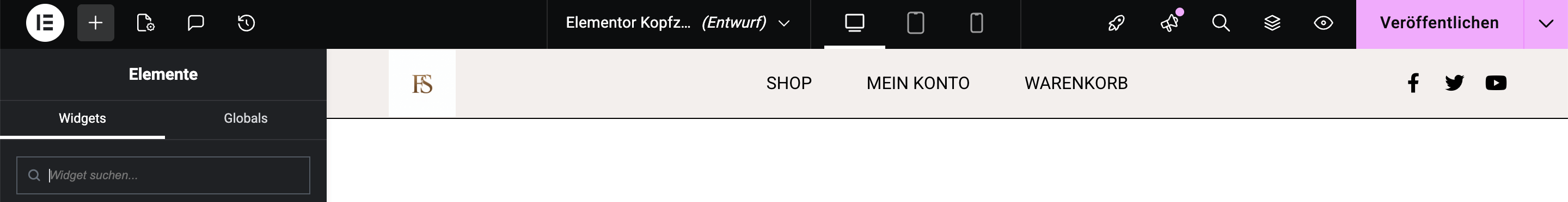 - Es öffnet sich jetzt dein Elementor, in dem du vielleicht den vorinstallierten WooCommerce Warenkorb nicht angezeigt bekommst.