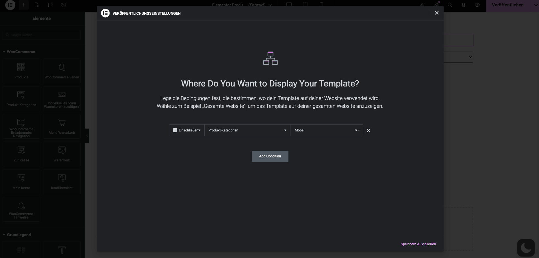 Hier fragt dich Elementor jetzt nach den Konditionen, also wo deine Template überall erscheinen soll: