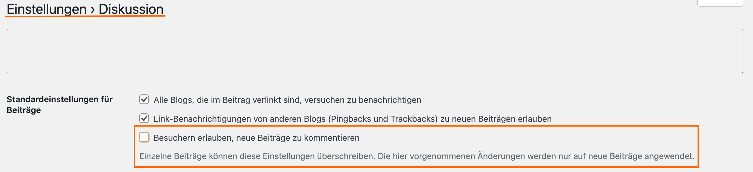 • Entferne den Haken und deaktiviere somit die Option „Benutzern erlauben, neue Beiträge zu kommentieren.“