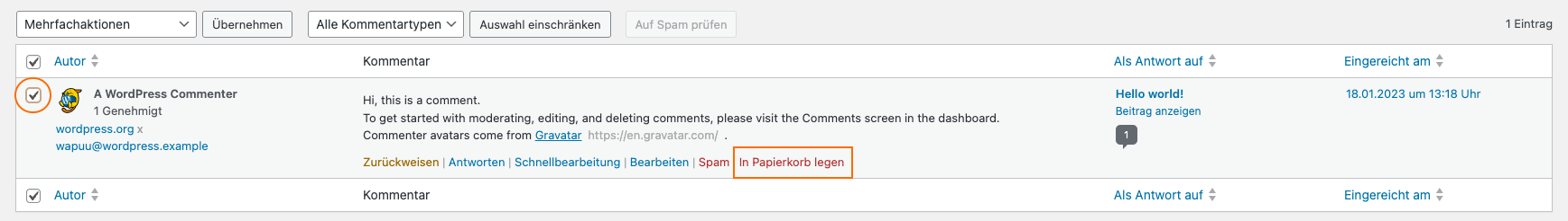 Diese kannst du ganz einfach auswählen und löschen – das ist natürlich auch als Mehrfachaktion für mehrere Kommentare möglich.