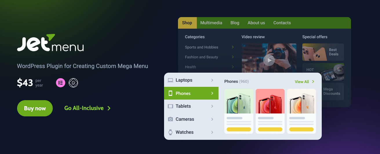 Besonders spannend für alle, die mit Navigationen arbeiten: JetMenu. Damit baust du Mega-Menüs, bei denen du nicht nur Links, sondern auch Bilder, Videos oder Widgets einbinden kannst. Perfekt, wenn du z. B. eine Agentur-Webseite mit vielen Unterseiten strukturieren willst, ohne dich durch die Limitierungen des WordPress-Menüeditors zu quälen.