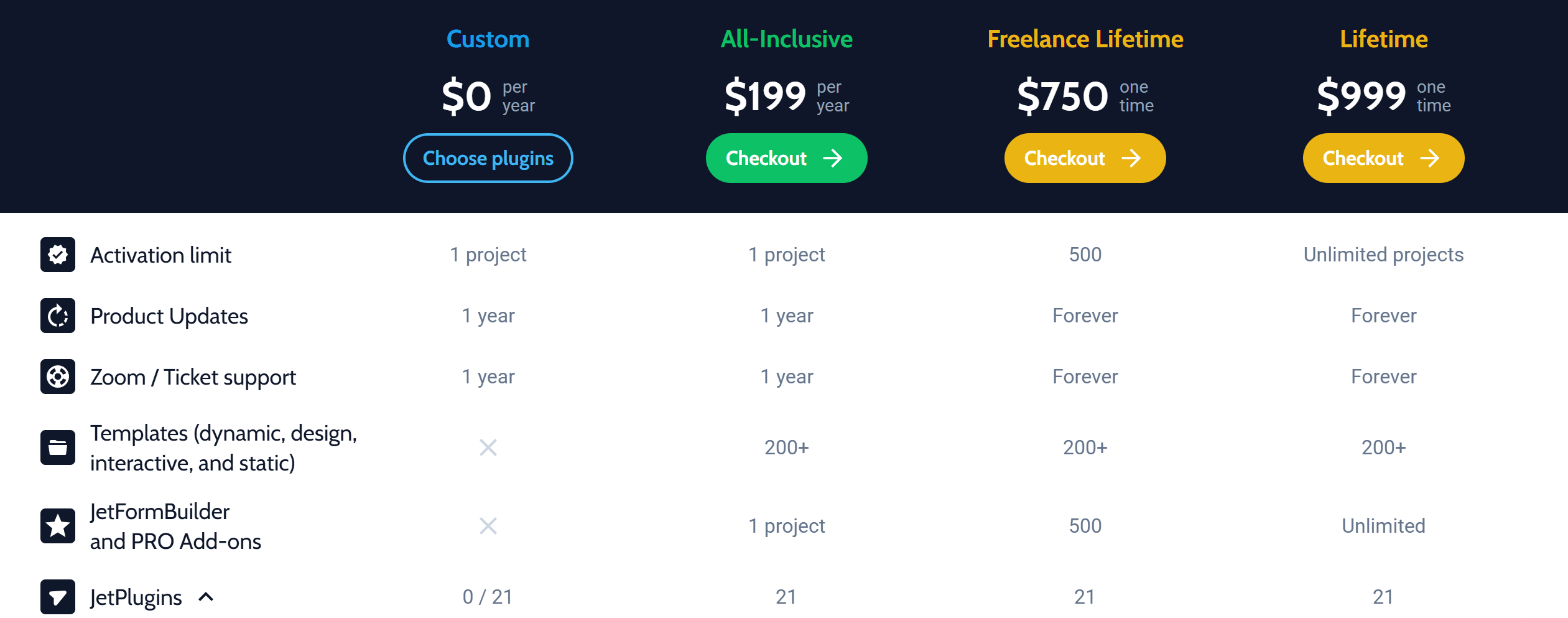 Crocoblock bietet dir zwei Preismodelle: Entweder du kaufst die JetPlugins einzeln, oder du schnappst dir das All-Inclusive-Bundle. Die Einzelpreise bewegen sich zwischen 15 und 45 US-Dollar pro Plugin und Jahr, was fair ist, wenn du gezielt nur JetEngine oder JetSmartFilters brauchst. Wenn du allerdings mit mehr als drei Plugins liebäugelst (und das wirst du sehr schnell), lohnt sich das Bundle deutlich mehr.