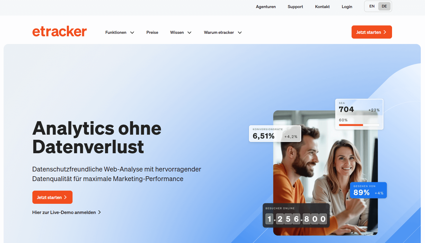 eTracker ist eine DSGVO-konforme Lösung aus Deutschland, die ohne Cookies tracken kann und auch ohne Opt-In-Banner auskommt. Ideal für Webseitenbetreiber, die sich Datenschutz „Made in Germany“ wünschen und trotzdem ihre wichtigsten Kennzahlen auswerten möchten.